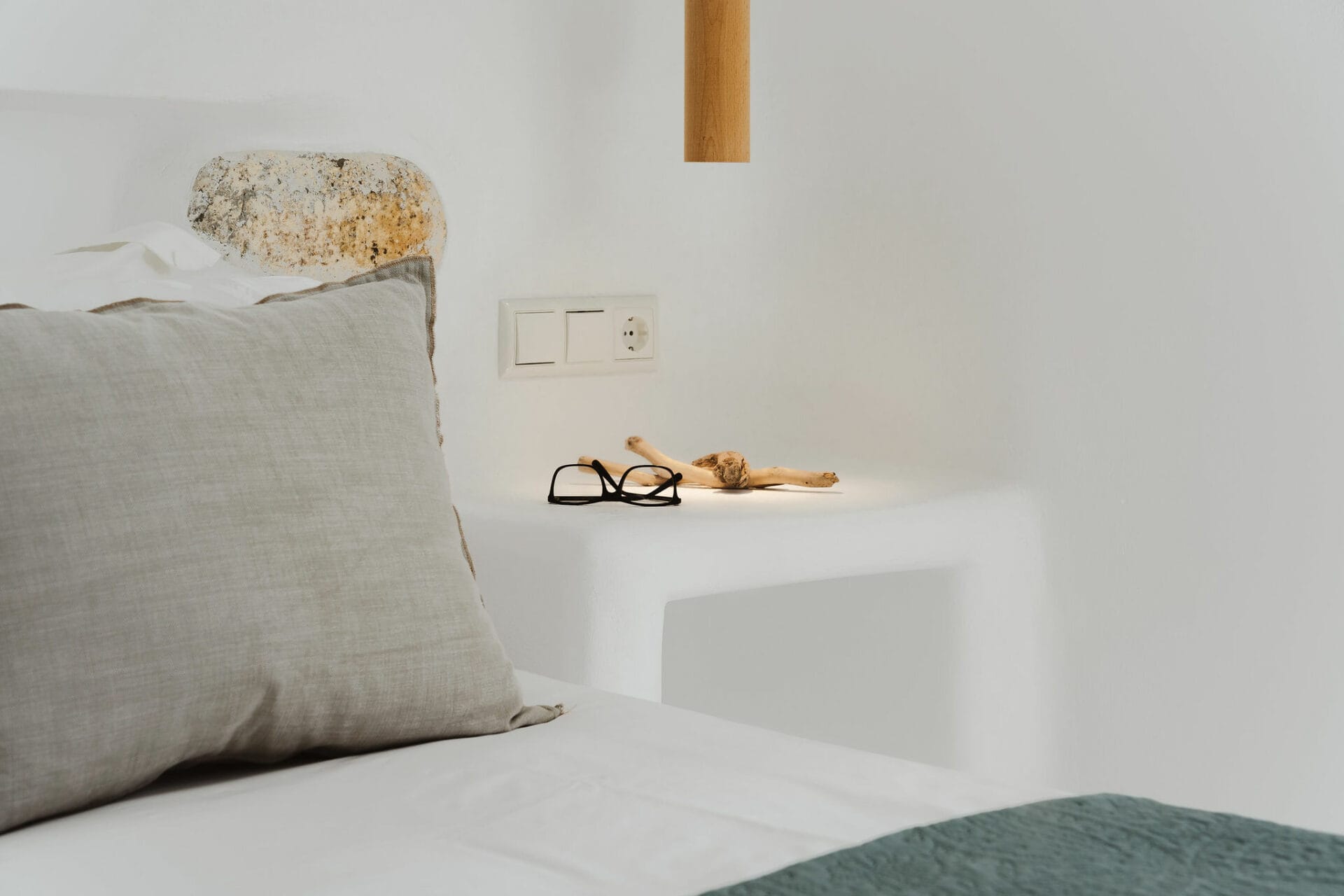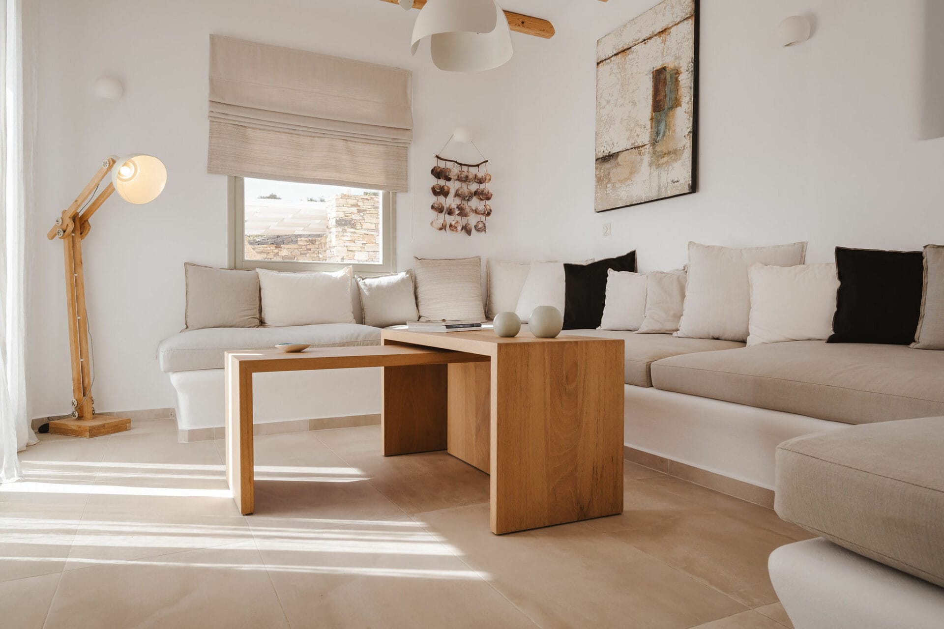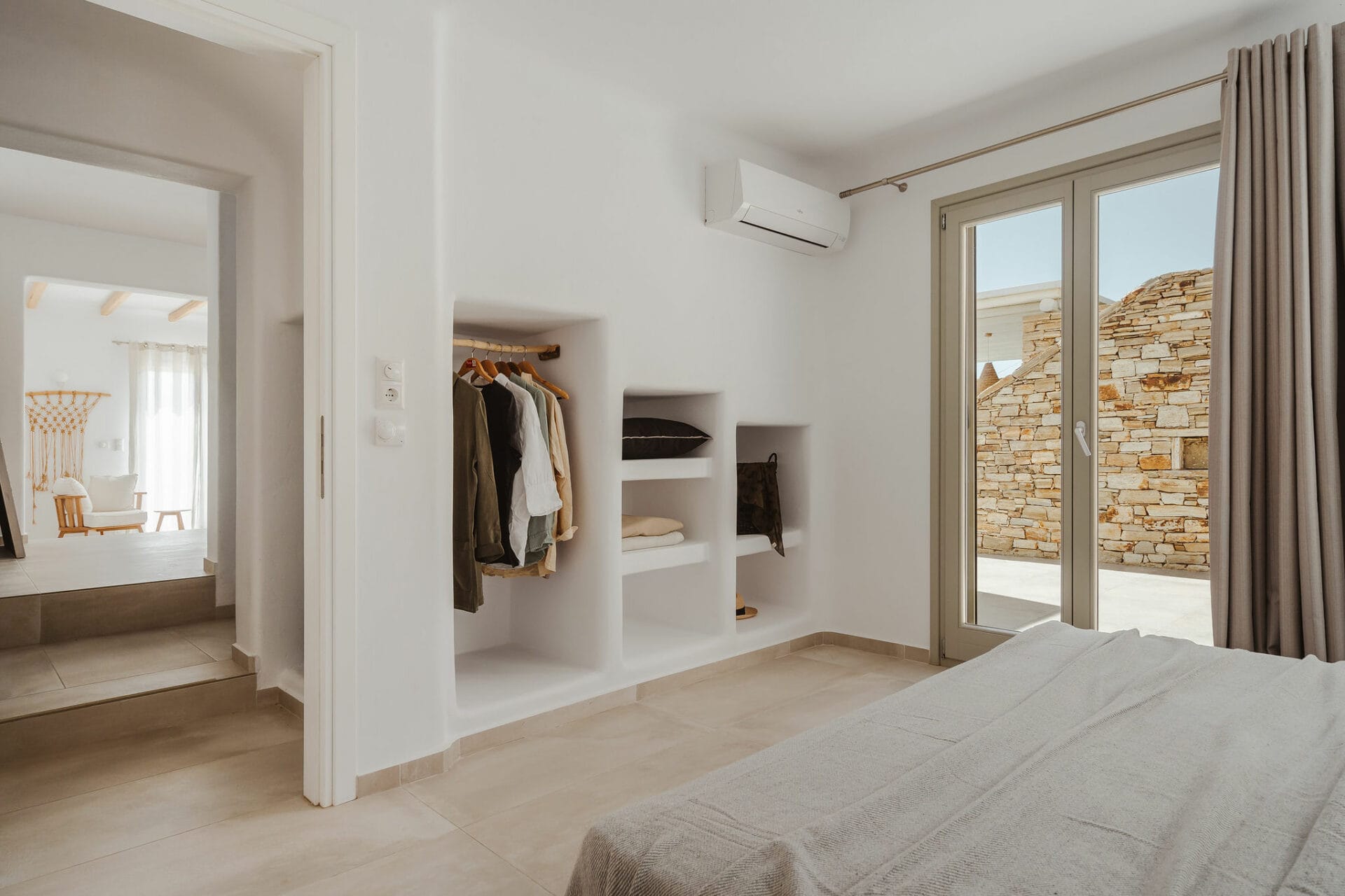 This villa has a bright white Cycladic look with carefully designed spaces meant to offer guests great luxury and overall comfort. Spread on two separate floors, there are four en suite bedrooms, all of which directly exit outdoors and offer sea views. The interior style is characterized by an overall modern decor with fresh white nuances and earth toned furnishings which create a very pleasant atmosphere.